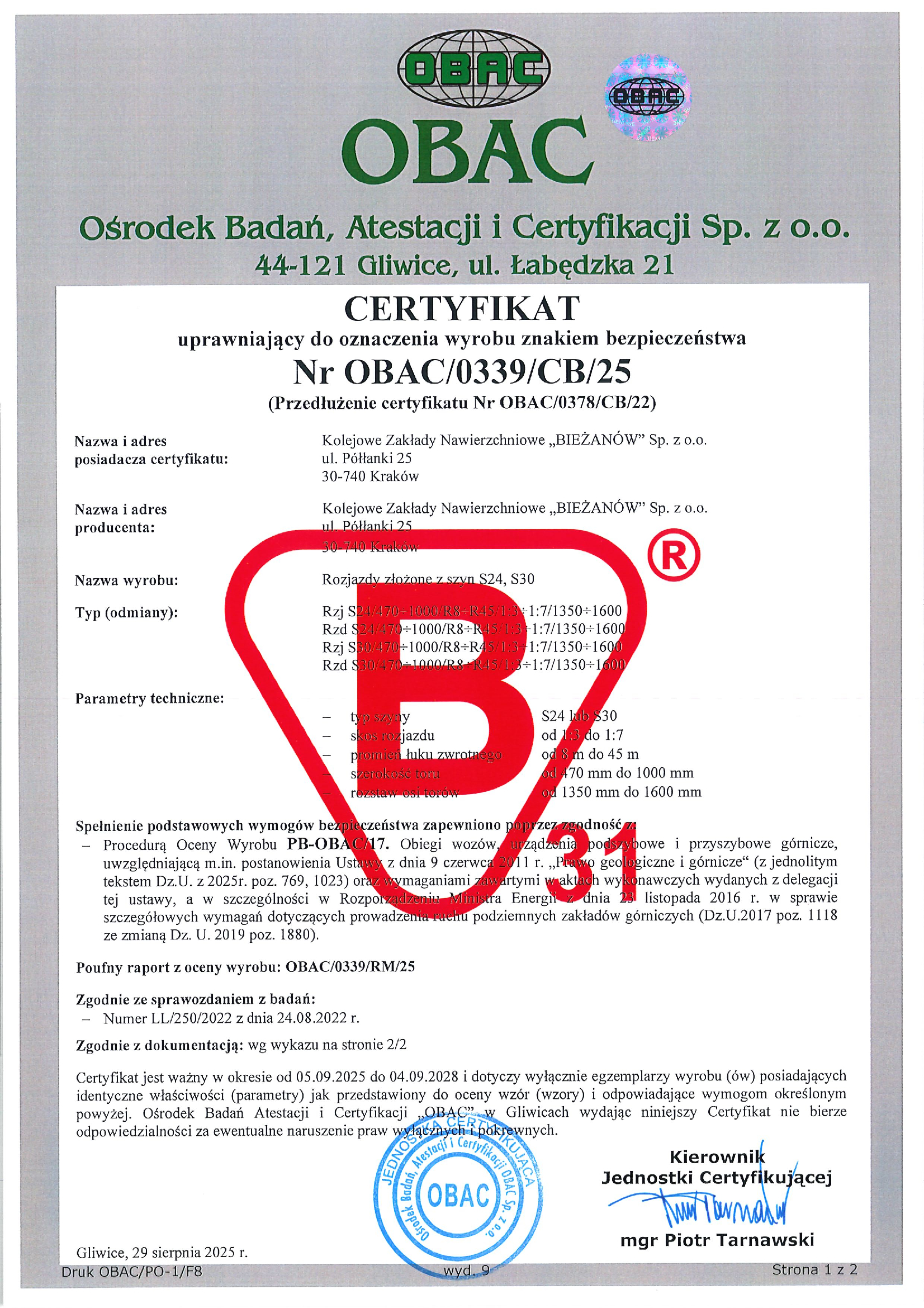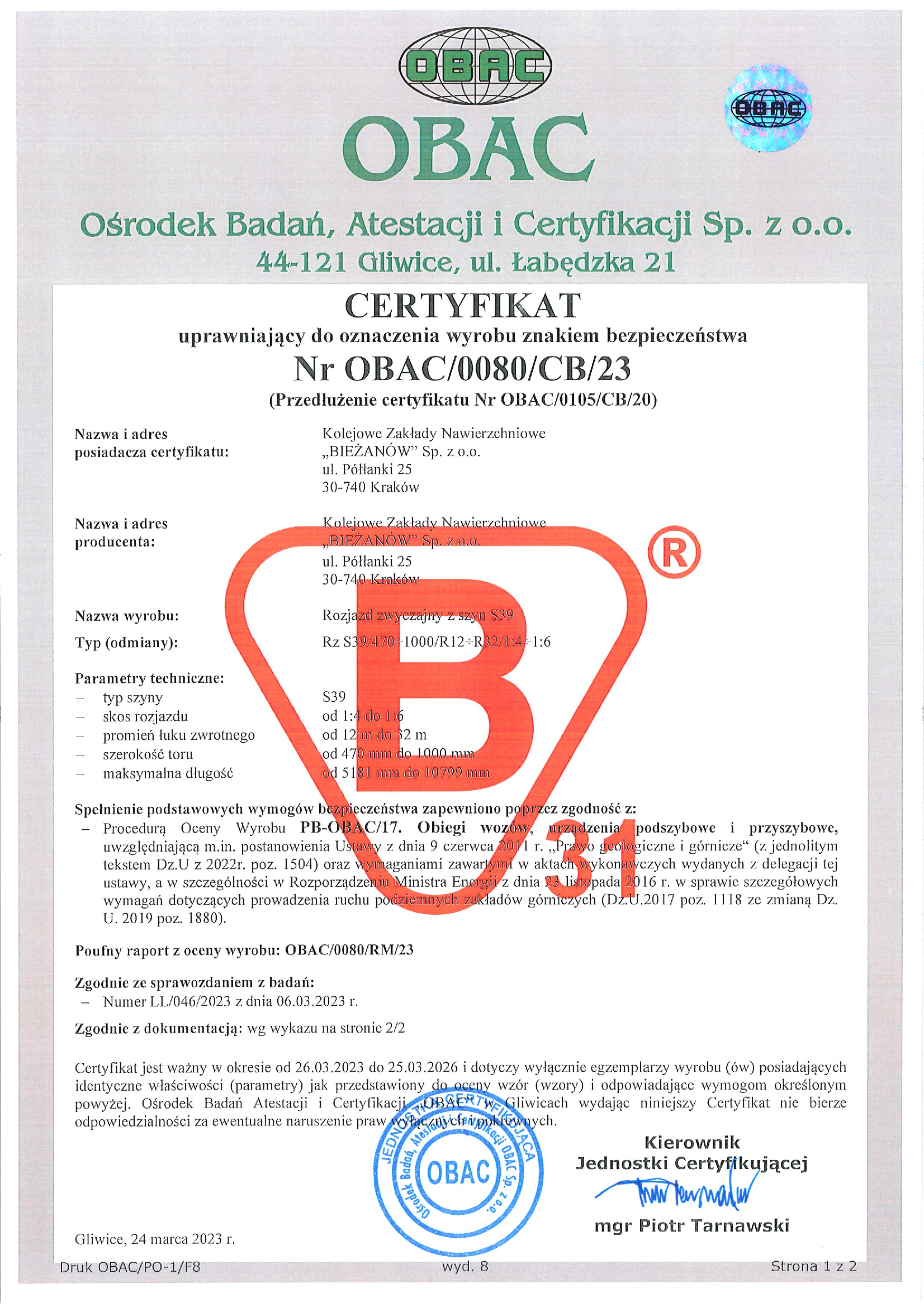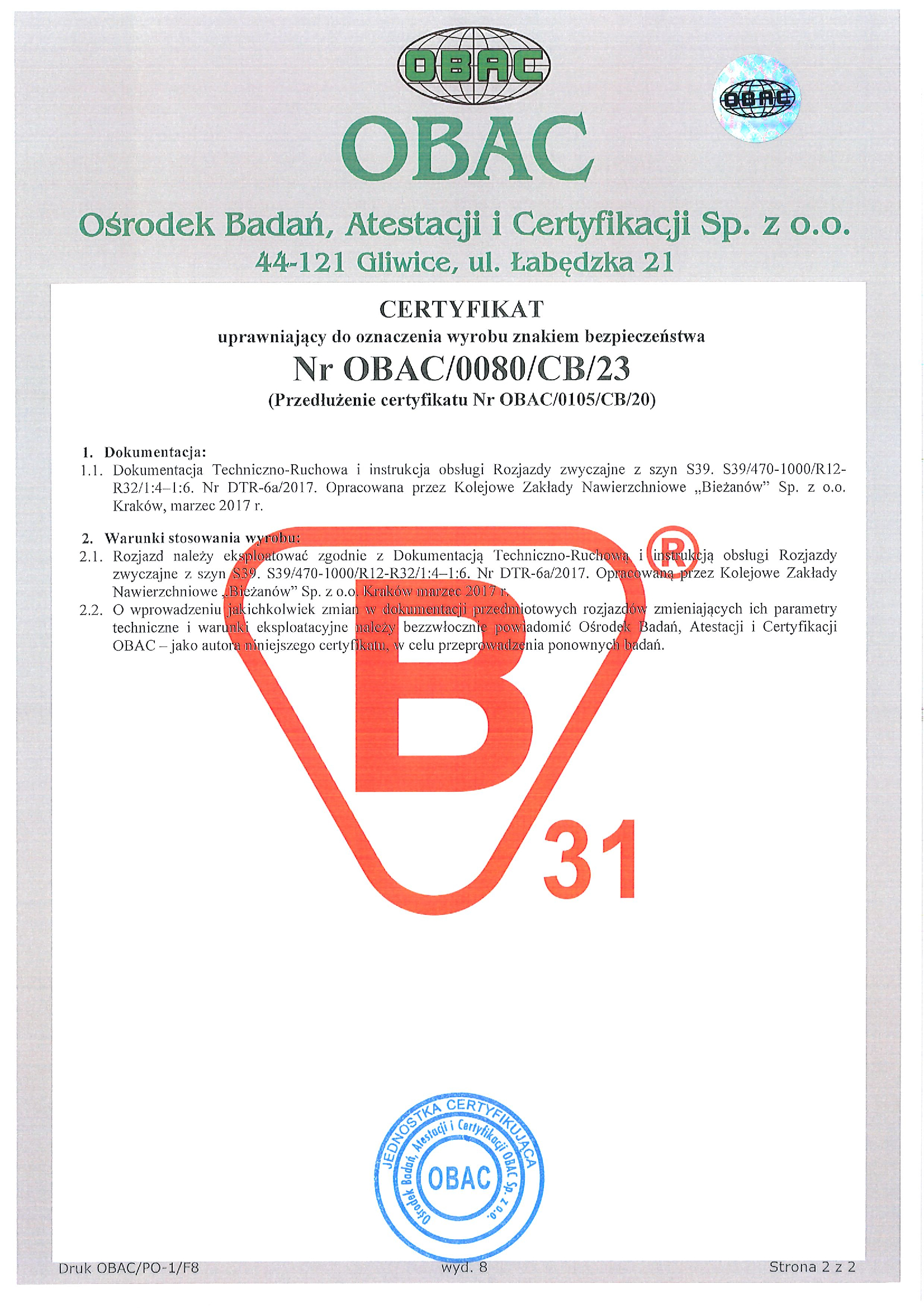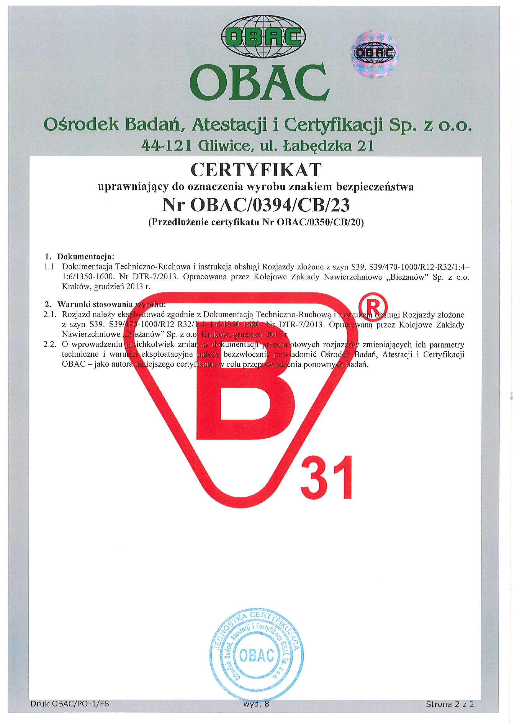Operating in the industry, where quality, technical reliability and repeatability translates directly the level of security of people and goods, use certification systems to confirm the high standards of our products. Certificates enable us to provide products to the markets of railway, trams and steel bridge construction.